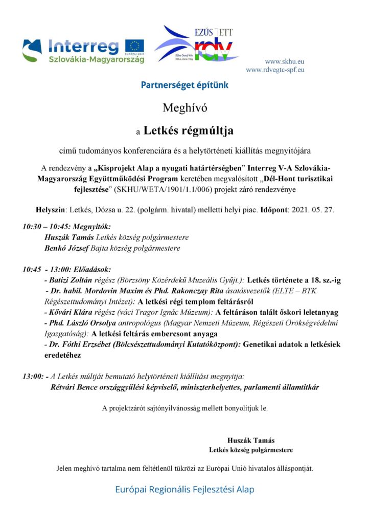 Tisztelettel hívunk és várunk minden érdeklődőt Letkés régmúltját bemutató tudományos konferenciára, és a helytörténeti kiállítás megnyitójára!