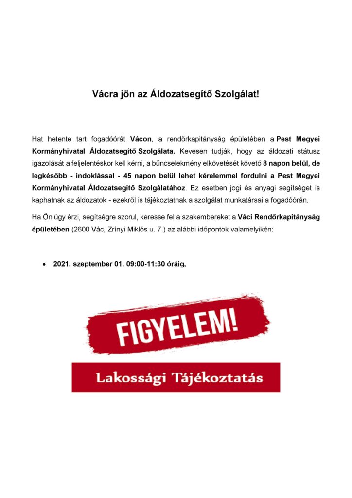 Vácra jön az Áldozatsegítő Szolgálat!